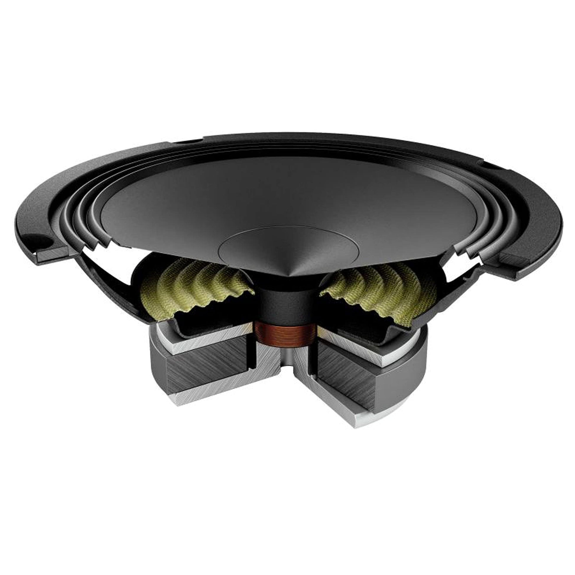 TPU (Thermoplastic Polyurethane) surround, featuring the exclusive shallow “Triple Wave” profile, for maximum excursion linearity. - Compact basket, protected by abrasion-resistant and scratch-proof coating, the motor is affixed with damping epoxy adhesive.