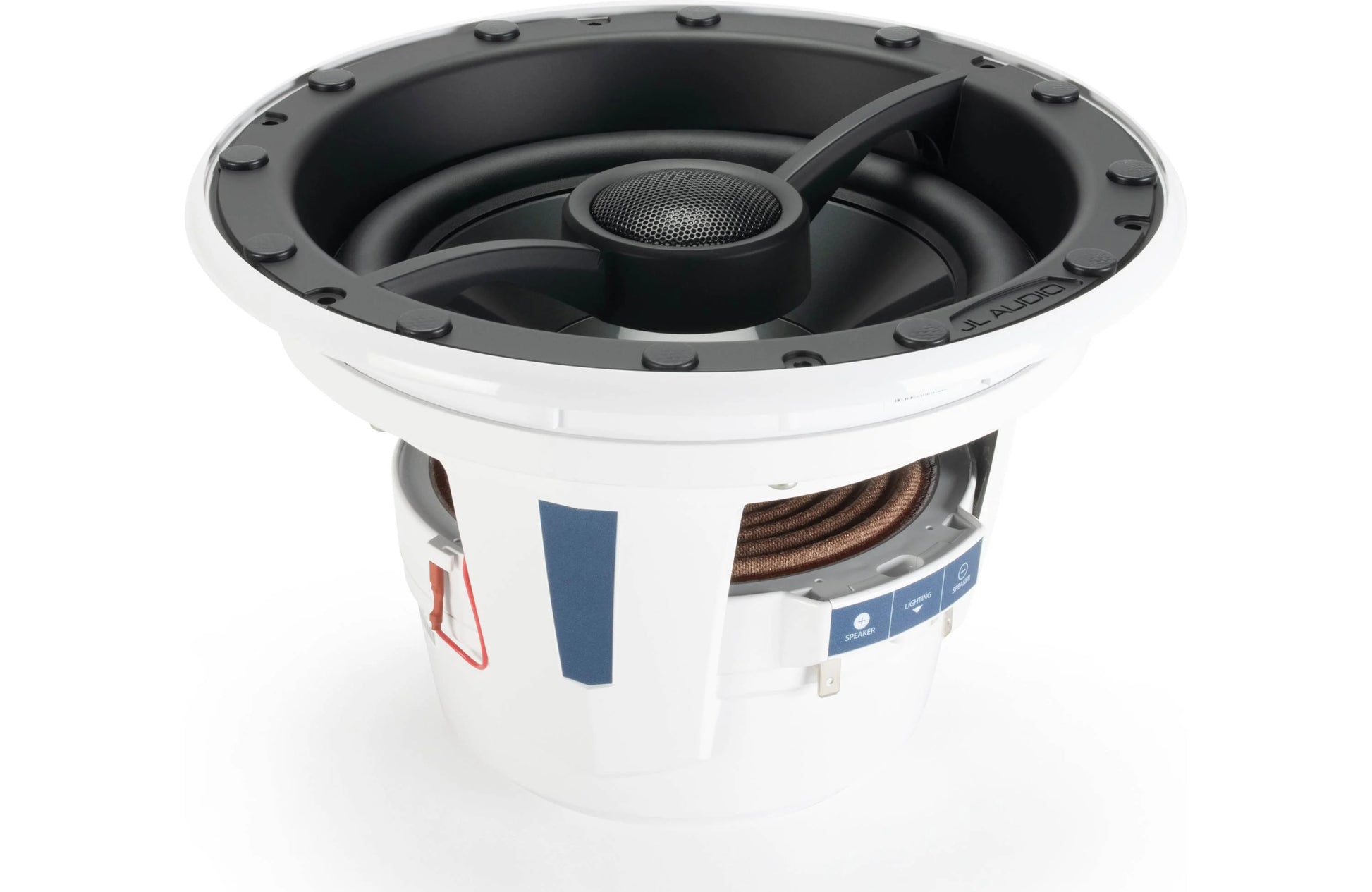 JL Audio M6-880X-L-GwSw-Single is an 8.8" 2-way marine-rated coaxial speaker engineered for high-fidelity onboard performance and real-world exposure to salt, spray, and UV. With an injection-molded mica-filled polypropylene woofer, treated silk dome tweeter, and 2-way crossover network built into the speaker assembly, it delivers detailed midrange and clear highs with strong low-frequency extension relative to its size.