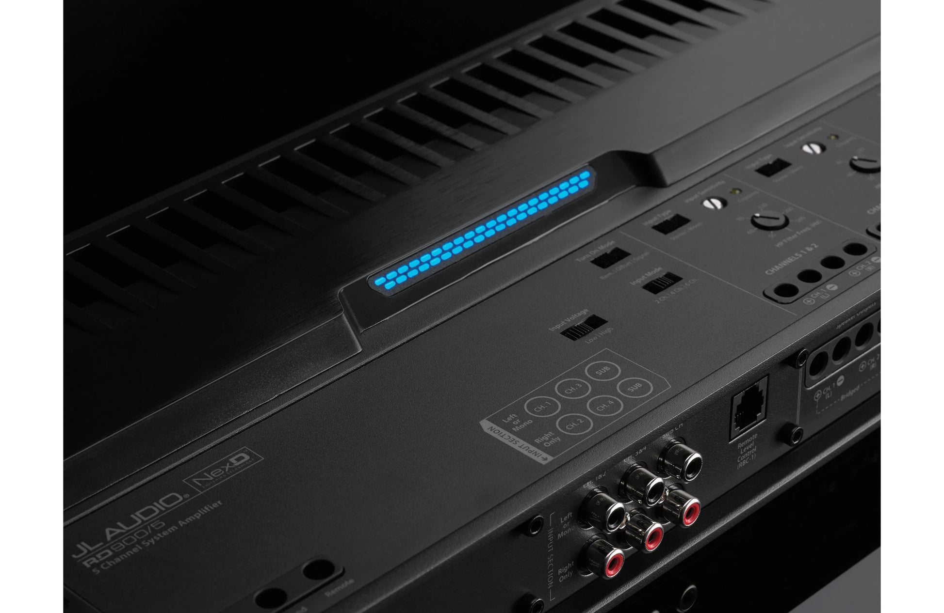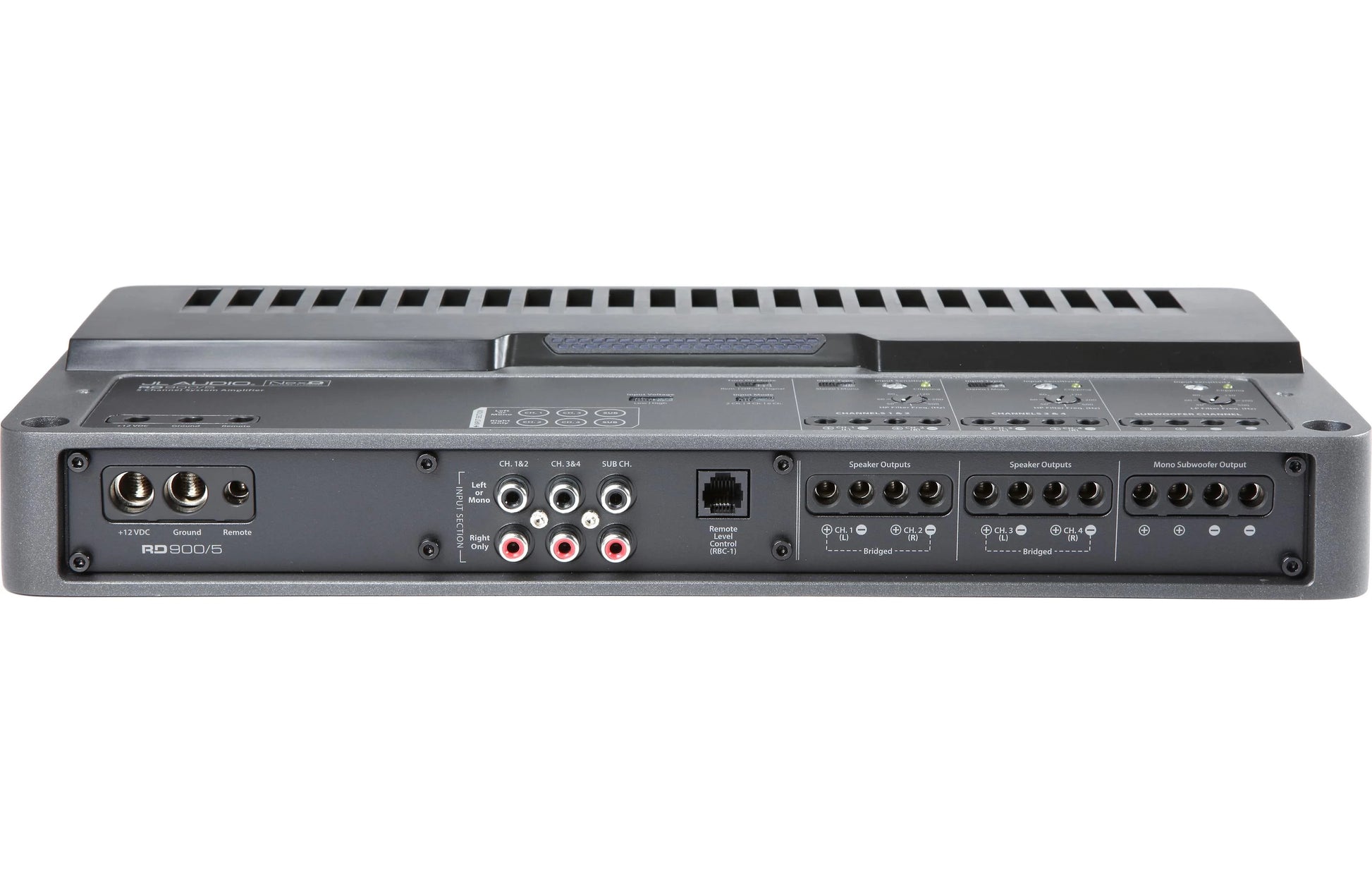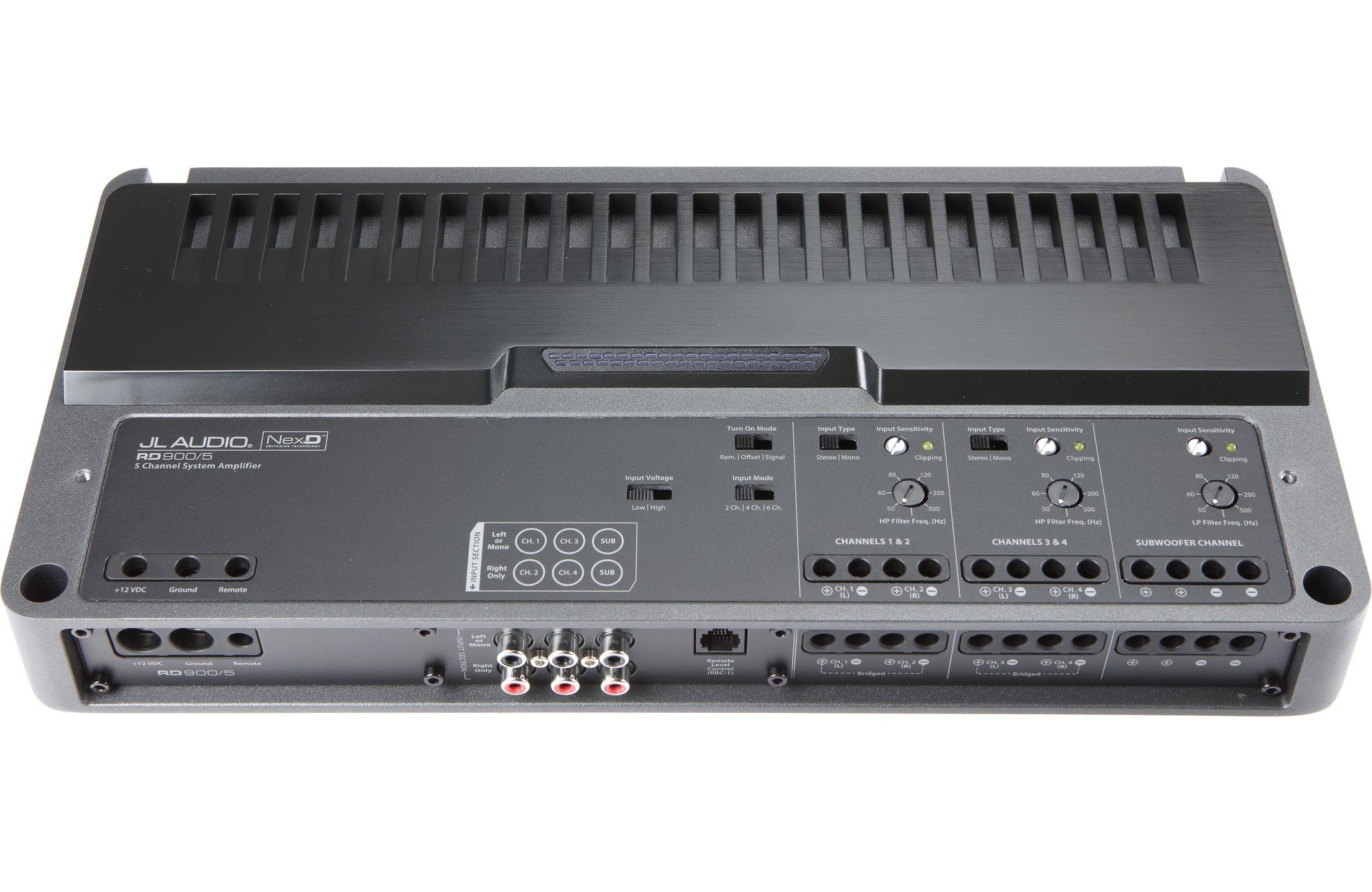 LED clipping indicators are also standard equipment for each channel section. This all-new, innovative feature lets you easily set your amplifier’s input sensitivity settings, quickly and accurately, with no special equipment needed. The RD900/5 features a durable, black powder-coated finish and a top-mounted, dual-color LED light strip that reports the overall status and condition. With the addition of an RBC-1 remote level control (sold separately), you can conveniently control the subwoofer’s output remotely from the driver’s seat.